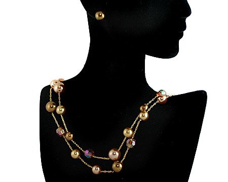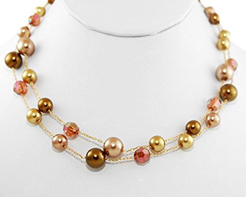 2 rows of alternating bronze, taupe, gold pearls and AB crystal beads make for a soft, elegant necklace. Necklace looks great for everyday or for a formal event. Necklace also looks great with a little summer dress or casual attire Length: 15.5" - 18.5" with attached extension Chain: Silver Clasp: Lobster Size of Pearl: 8mm & 10mm Pearls and 8mm Crystal BeadsFeature