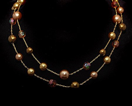 2 rows of alternating Bronze, Taupe, Light Gold faux pearls and AB crystal beads make for a soft, elegant necklace.
