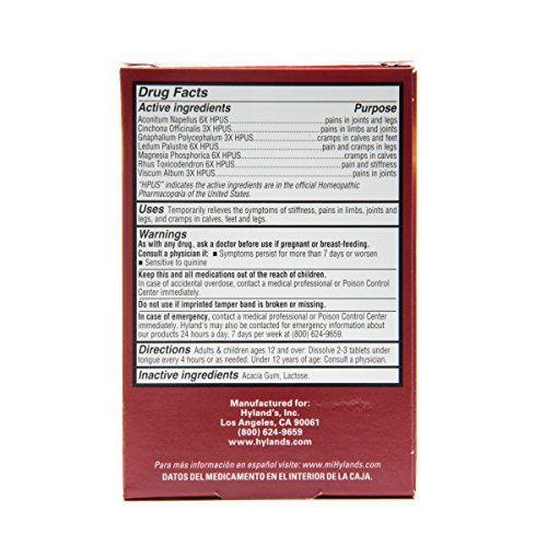 Temporarily relieves the symptoms of cramps and pains in lower back and legs. Hyland's Leg Cramps with Quinine relieves the symptoms of cramps and pains in the lower back, legs and feet that can disrupt your life. America's #1 OTC leg cramp medicine, Hyland's formula relieves late night charley horse cramps and can be taken day or night without drowsiness. Hyland's Leg Cramps with Quinine is safe to take with other medicines, and has no contraindications and no drug interactions.Feature