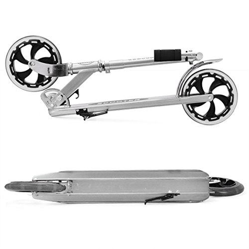 -. Feature : [DESIGN]-The hand bar can be adjusted, the height can be changed between 4 level, range from 78cm/30.4inches to 93cm/36.3inches, you can adjust according to your different needs, with a kick stand for stable stop / [SAFE]-Advanced technology of rear brake / suspension provides better stability and security. The mudguard serves as brake as well by simply pushing down with the foot, giving super good riding experience. / [COMFORTABLE]- The two-big-wheel scooter with extra-large 8"(200mm) urethane wheels and Soft hand grips, which is greatly reduces vibrations in Plain/Bumpy/Rough Road, providing more comfortable riding experience. Soft grips, sponge and folding handlebar, comfortable feeling / [CONVENIENT]-The Kick scooter can be folded in a short time, the folding system make it suited to carry to anywhere, space-saving when storage. It has no restriction to take on tube, train, bus, subway or car, very convenient / [DURABLE]- The folding scooter is made of lightweight aircraft-grade aluminum alloy frame and reinforced heat-treated aluminum alloy deck with full-deck grip tape can hold riders weight up to 220lbs+. The Wheel are made of resistant durable PU for a long-term use
