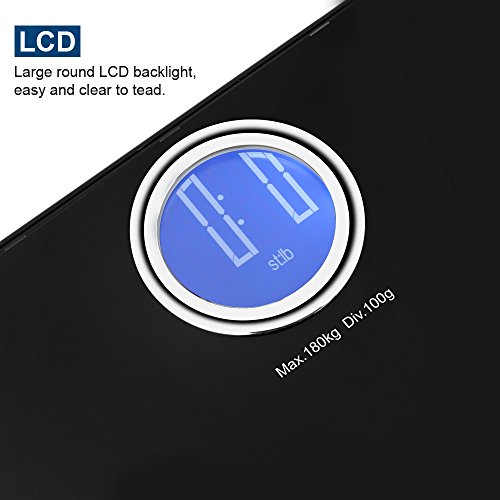 -. Feature : Simplicity and stylish designed,smooth edge: colors available in silver/black. / Smart step-on technology - no more tapping or turning on a switch to use the scale. Just step on the scale to get instant readings. / Non-slip feet will not scratch floors,and the tempered glass platform provides exceptional sturdiness,safety and comfort. / Multifunction: Auto-power-off/on,Low battery and overload indication to save your battery life.easy to switch between kg lb st, meet all users' needs. / Specialy round LCD display with backlit - easy to read measurement from any distance, or light condition. Auto-calibrated and automatically turns off to conserve battery life.