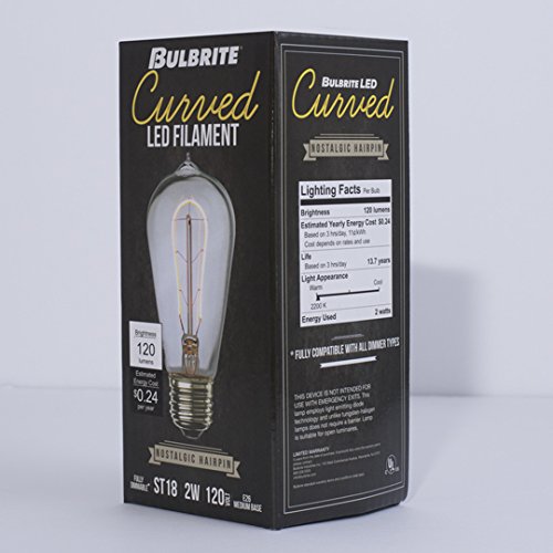 Bulbrite 776510 LED2ST18/22K/FIL-NOS/CURV/1890 2W 2200K E26 Base LED Curved Filament Bulb, Antique