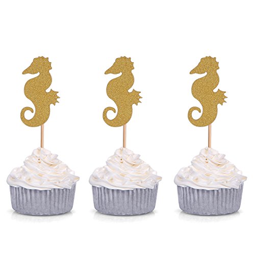 Set of 24 Golden Sea Horse Cupcake Toppers Under the Sea Theme Party Decors - by Giuffi