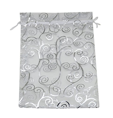 SUNGULF 50pcs Organza Pouch Bag Drawstring 4x6" 10x15cm Strong Gift Candy Bag Jewelry Party Wedding Favor (White with Silver)