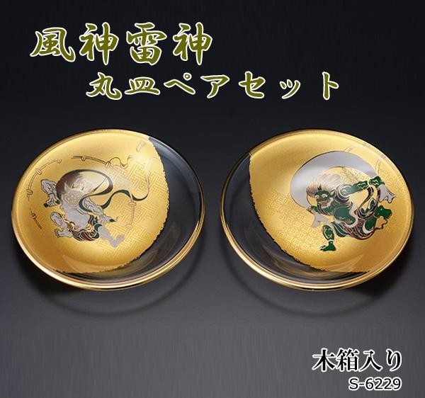 | 風神雷神図をグラスにあしらった丸皿のペアセットです。和菓子などはもちろん、小物置きのトレイとしてもおススメ。木箱入りなので贈答用に最適です。 |
