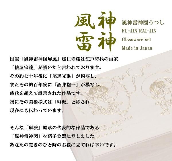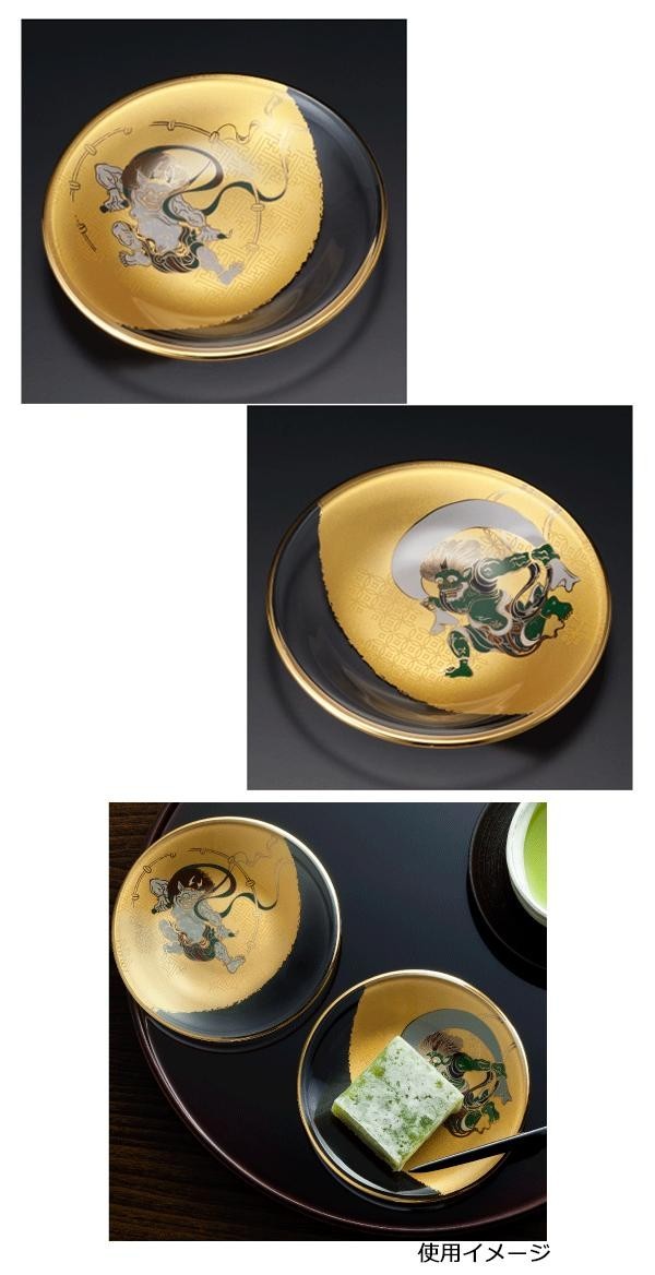 風神雷神図をグラスにあしらった丸皿のペアセットです。和菓子などはもちろん、小物置きのトレイとしてもおススメ。木箱入りなので贈答用に最適です。 |