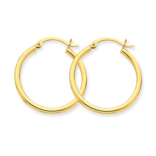 Simple and classic, our polished14k yellow gold round hoops feature a hinged post and a lightweight, hollow tube design that measures 2mm thick by 25mm (1 inch) in diameter.