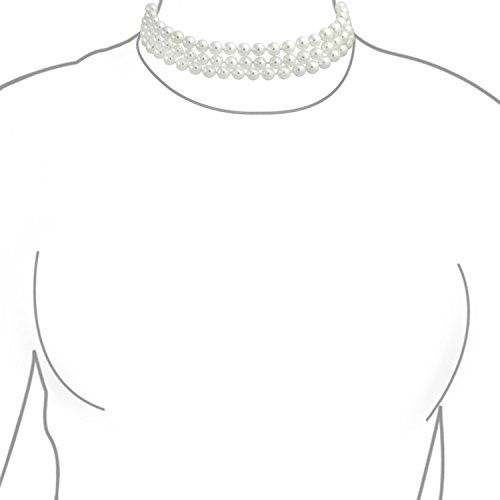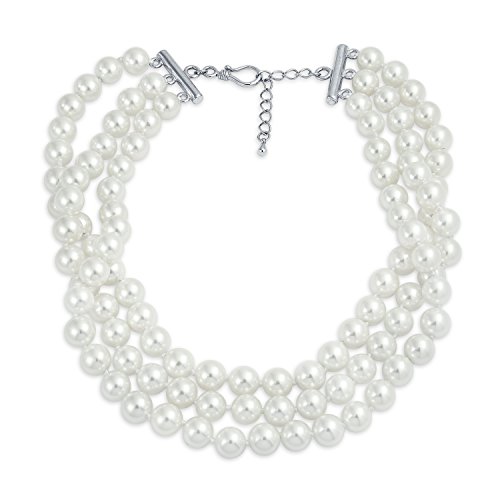 Show everyone your impeccable taste when your wear our elegant three strand Simulated Pearl choker. Simulated has never been more fashionable. Our stunning multi strand necklace is sure to make heads turn when you wear it. Three strands of 8mm simulated Simulated Pearls are crafted with a fine quality Simulated Pearl alloy. This 13in three strand Simulated Pearl necklace with a 2in extender features a rhodium plated finish to resist tarnish. Three strands of shimmering beauty will highlight your collarbone and give give you a radiant look every time you wear this Simulated Pearl choker necklace. If you decide to wear it on your wedding day, affordable bridal jewelry makes a great gift for members of your bridal party. They will have a wonderful gift to cherish long after the party ends. And remember to include the mother of the bride.Feature