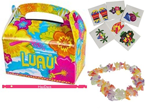 -. Feature : Each favor box measures, 6.25" x 3.5" x 3.25"! / These brightly colored Hawaiian leis are made from artificial silk flowers. Perfect for any beach party or luau. Contains medium sized petals. Size 36" L. / Assorted Tattoos: hula girl, aloha, dolphin, hibiscus, bird of paradise designs. 144 Total!!! / These luau temporary tattoos are a fun addition to a party favor bag. Apply the tattoo with water and remove by rubbing off / *And A Small Thank You Card From Us At Heydays*