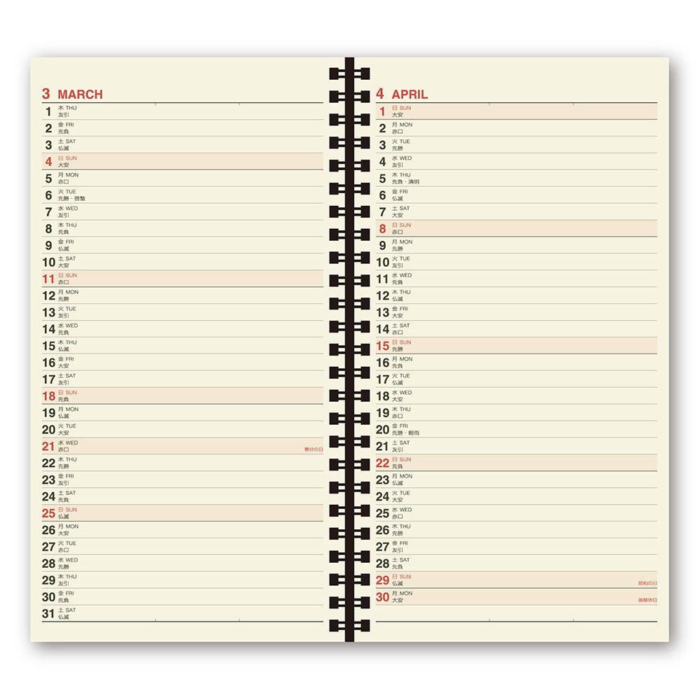 【Monthly page】 Layout of page type in which the dates are arranged vertically in two-page spread.