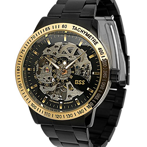 -. Title : ESS Men's Black Strap Watch Skeleton Mechanical Wrist Automatic Movement Stainless Steel Golden Case
