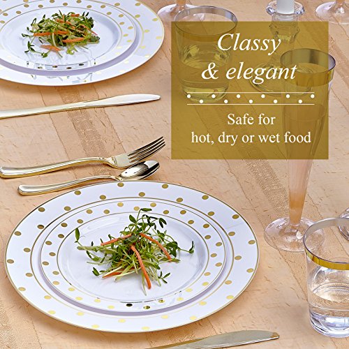 Party Disposable 40 pc Dinnerware Set | 20 Dinner Plates and 20 Salad or Dessert Plates | Heavyweight Plastic Dishes | Elegant Fine China Look | for Upscale Wedding and Dining (Dots– White/Gold)