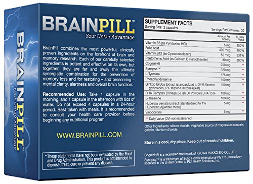 Studio : Leading Edge Health Publisher : Leading Edge Health Binding : Health and Beauty Product Description You're slowing down by the day. The average brain peaks at 30. Then it's a sad decline that can get significantly worse. BrainPillTM is designed to fight that, and help protect related brain function, with a series of high quality natural nootropics shown to promote: Stronger Memory Faster Recall Mental Performance Under Pressure Efficient Problem Solving Better Concentration Higher Productivity More! It's an easy boost to your brain power and productivity. Just take BrainPillTM as directed and you're quick, sharp and highly productive! 0