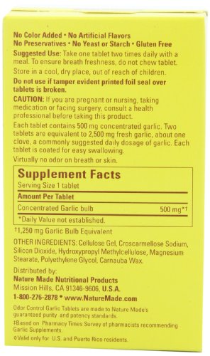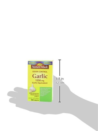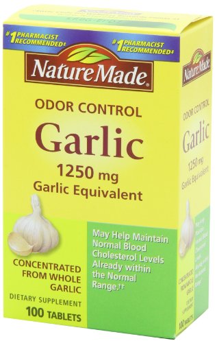 -. Binding : Health and Beauty -. Brand : Nature Made -. Feature : Concentrated from whole garlic. / May help lower blood cholesterol levels. / Contains 1,250 mg of concentrated garlic bulb per serving. -. Label : Nature Made -. Manufacturer : Nature Made -. ProductGroup : Health and Beauty -. ProductTypeName : HEALTH_PERSONAL_CARE -. Publisher : Nature Made -. Studio : Nature Made -. Title : Nature Made Odor Control Garlic, 1250mg, 100 Tabs