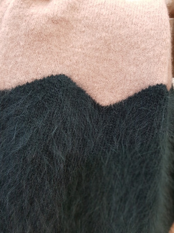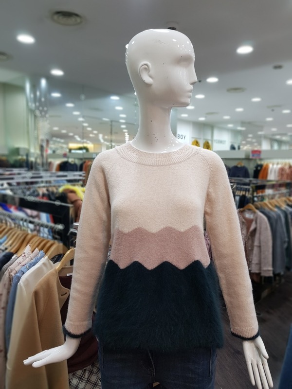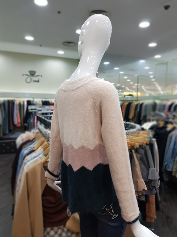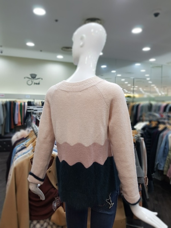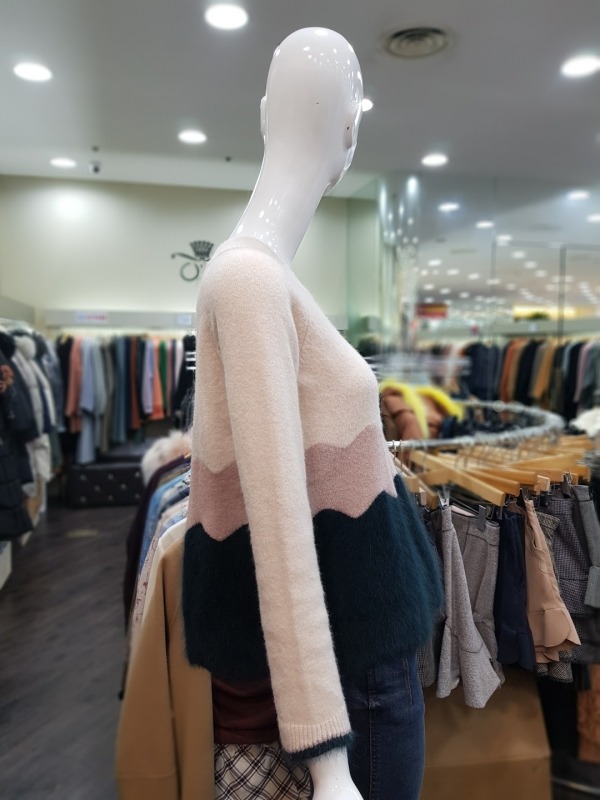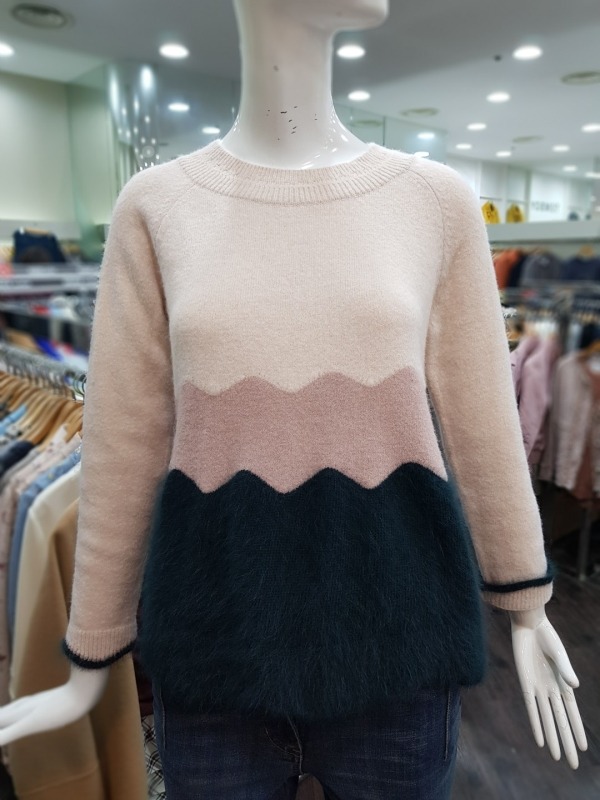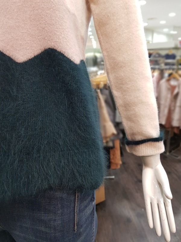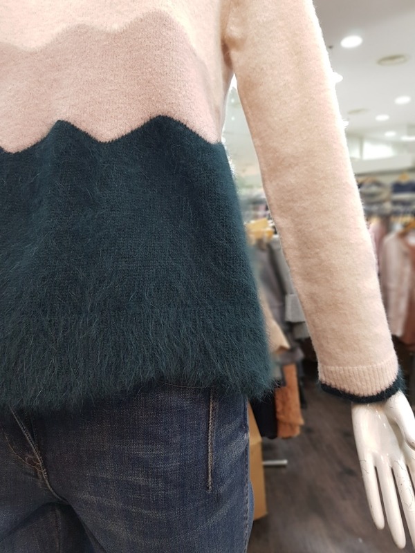 소매와 밑단이 물결 모양으로 컷딩 되어 있으며, 컬러 역시 물결 모양으로 배색되었습니다. 앙고라느낌을 준 모혼방 소재로 앙고라처럼 털이 많이 빠지지 않아 착용하기 더욱 좋습니다.