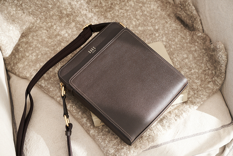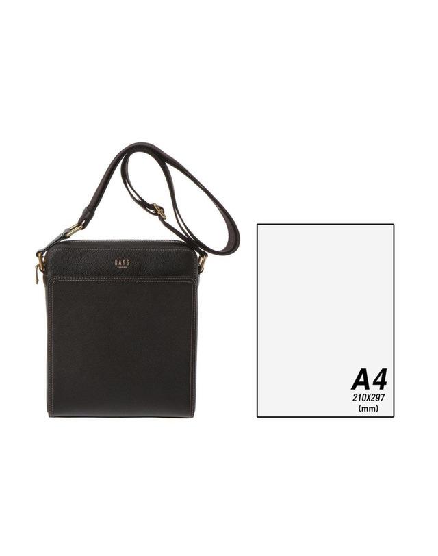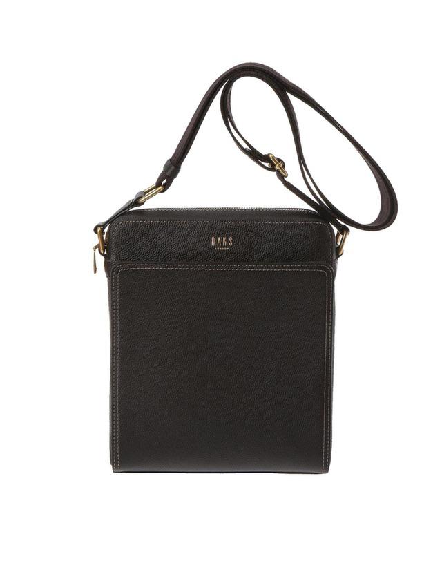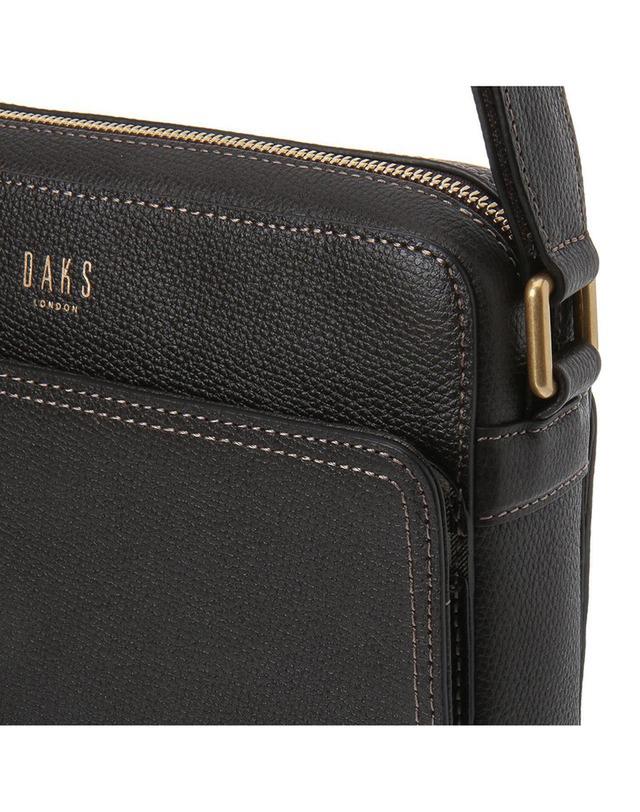 슈렁큰 레더 바탕에 골드 컬러의 DAKS 로고 장식이 있고 앞쪽 포켓 안쪽에 체크 패턴을 배색하여 포인트를 준 크로스백입니다.