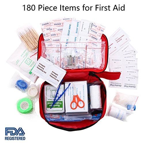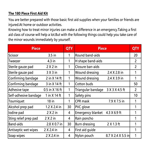 - ESSENTIAL AND UPGRADED ITEMS:180 piece valuable medical supplies,based on customers' feedback. Complete first aid kit, designed for a large variety of injuries. Recommended for most daily use or survival adventures: Car, Home, Office, School, Road Trips, Camping, Hiking, Hunting, Travel, Sports, Workplace, Kids Playground.etc