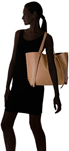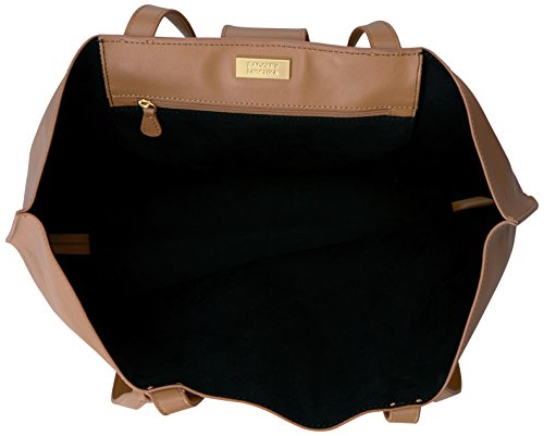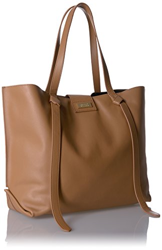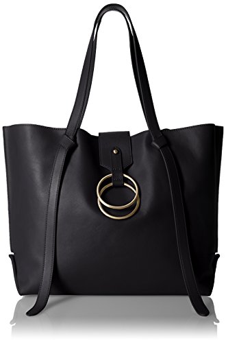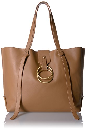 Spacious leather tote features luggage tag-inspired closure, gold-tone rings, and top handle straps that extend down front