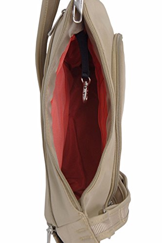 Fabric/Polyester Main compartment has RFID blocking card and passport slots