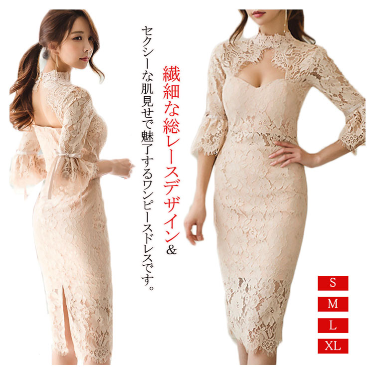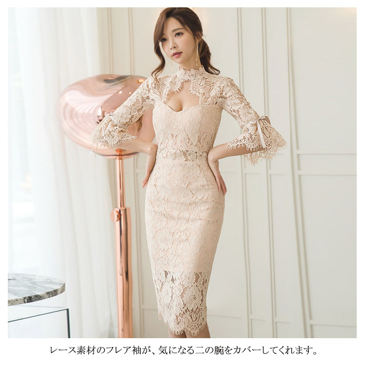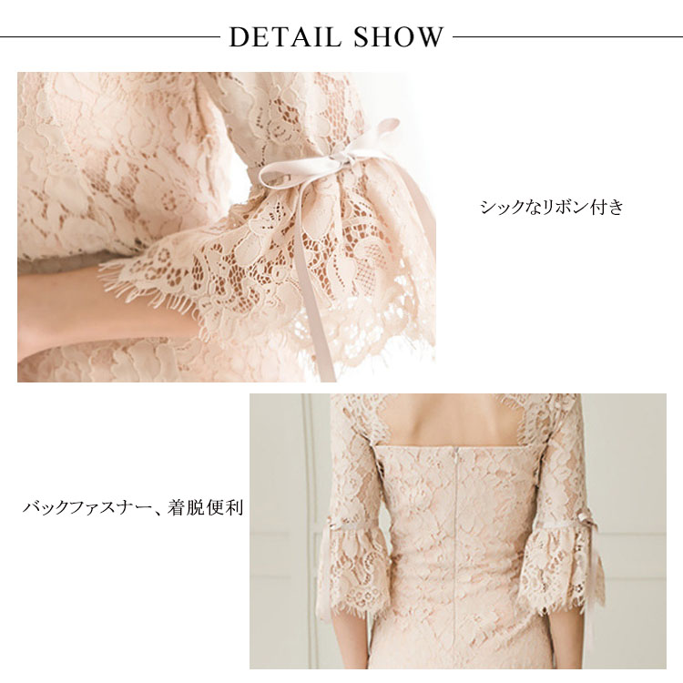 | 繊細な総レースデザイン&セクシーな肌見せで魅了するワンピースドレスです。レース素材のフレア袖が、気になる二の腕をカバーしてくれます。上品な丈感で、清楚な雰囲気を醸し出してくれます。結婚式やパーティーなどのお呼ばれシーンに相応しい気品のある1枚。 | |