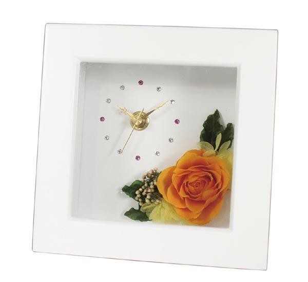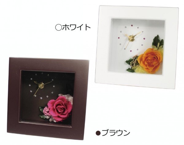 生花の風合いに近い状態で長期にわたり楽しめるプリザーブドフラワーを使用した時計です。 |