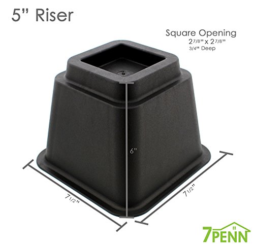 Studio : 7Penn Publisher : 7Penn Product Description The 7Penn Bed Riser Set of 5" Inch Black Furniture Risers will safely give your furniture a little boost. Use these 4 risers to give your bed, chair, or coffee table 5 inches of additional height. With these risers, you can efficiently create more room for under bed storage, make it easier for elderly to get in and out of a chair, and keep your sheets from hitting the floor so bed bugs can't crawl directly from the carpet to your sheets. Most wooden or metal legs and caster wheels fit securely into the 3 x 3 x 3/4 inch (7.6c x 7.6c x 2cm) deep built-in recess cups. This package includes 4 black risers that are each 5 inches (12.7cm) tall. Invest in the 7Penn Bed Riser Set of 5" Inch Black Furniture Risers - They are safe, stable, and super efficient for any home or office! 0