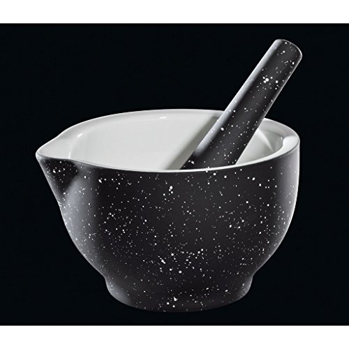 -. Feature : This mortar and pestle comes from Cilio. It is made from porcelain fired at 1,300°C. / It has a cream interior and the outside is finished in black with cream speckles. / The individually handcrafted pestle has a black and cream speckled upper portion with a cream lower portion.