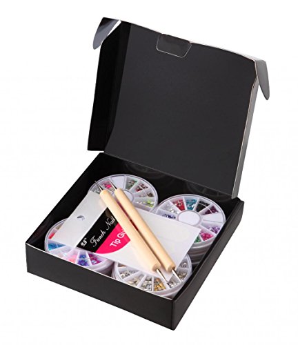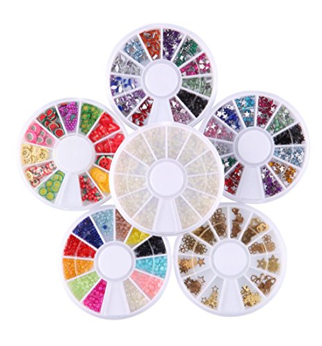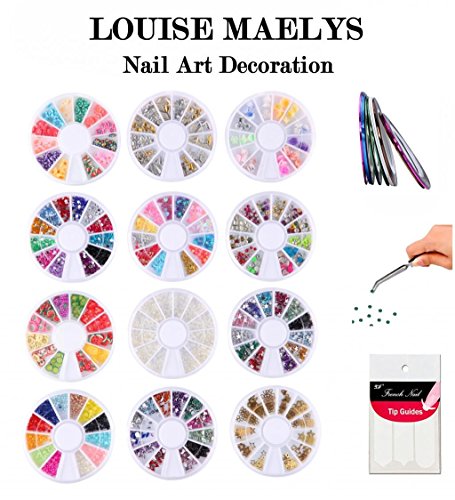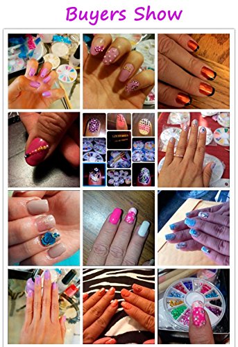 Features 1. 3D nail art decorations: 12 wheel nail decoration beads, about 144 different colors and styles, can satisfy all of your needs for nail art DIY. The shape includes pearl, water drop, plum flower, fruit, star, moon, round, bow-knot, etc. 2. French Tip Guides: Help you paint your fingernails with perfect lines 3. Dotting pen: Help you to pick up the decoration easily. You also can use this useful tool for creating a marbling design, creating swirls and textured finsihes. It can be used for creating dots - of an even or decreasing size - and to pill dots into petal shapes when doing finely detailed flowers