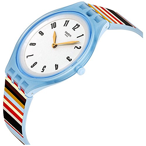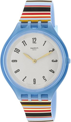 Swatch Skin Skinstripes Grey Dial Silicone Strap Unisex Watch SVUL100. 40 mm semitransparent light blue plastic case with a grey dial, a plastic crystal, yellow hands, and grey Arabic numeral hour markers. Printed logo beneath the 12 o'clock position. Hands: hours and minutes. Case thickness of 6 mm. Push / pull crown. 17 mm multicolored silicone strap with a light blue plastic buckle clasp. Quartz movement and water resistant up to 30 meters. Skin series.Feature