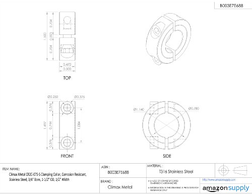 Climax Metal CR2C-075-S Clamping Collar, Corrosion Resistant, Stainless Steel, 3/4" Bore, 1-1/2" OD, 1/2" Width