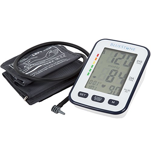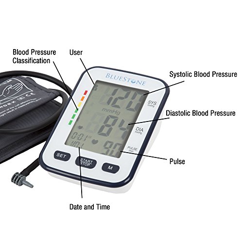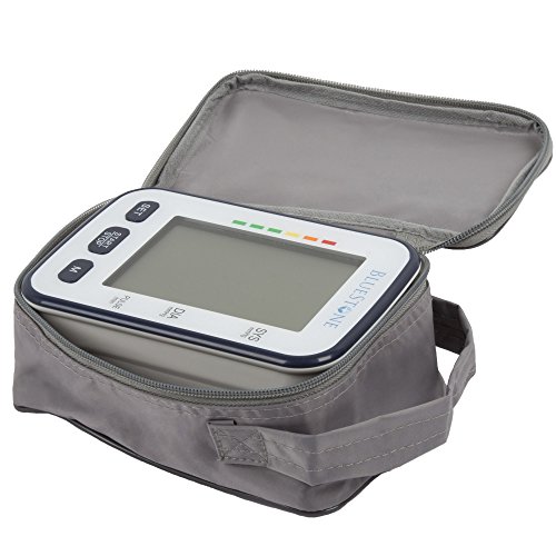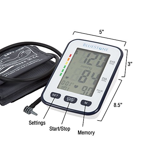 The Bluestone Automatic Upper Arm Blood Pressure Monitor is designed to be a fully automatic, one button operation that is convenient to use for at home or on the go blood pressure monitoring. Simply apply the cuff to your arm and press the start button. Systolic, diastolic and pulse readings are displayed simultaneously on the LCD screen. The monitor features a hypertension indicator that provides a comparison to standards set by the World Health Organization. Featuring two memory groups, allowing multiple users to save individual test results (up to 60 memories per group) with date and time stamp. Includes a storage bag for protection and portability. Dimensions: Length: 6.5 inches, Width: 4.5 inches, Height: 2.5 inches. Case: Length: 5 inches, Width: 8.5 inches, Height: 3 inches. Air Tube Length: 28 inches. Fits Arms Up to 13 inches in Circumference, Requires 4 AA Batteries (Not Included).Feature