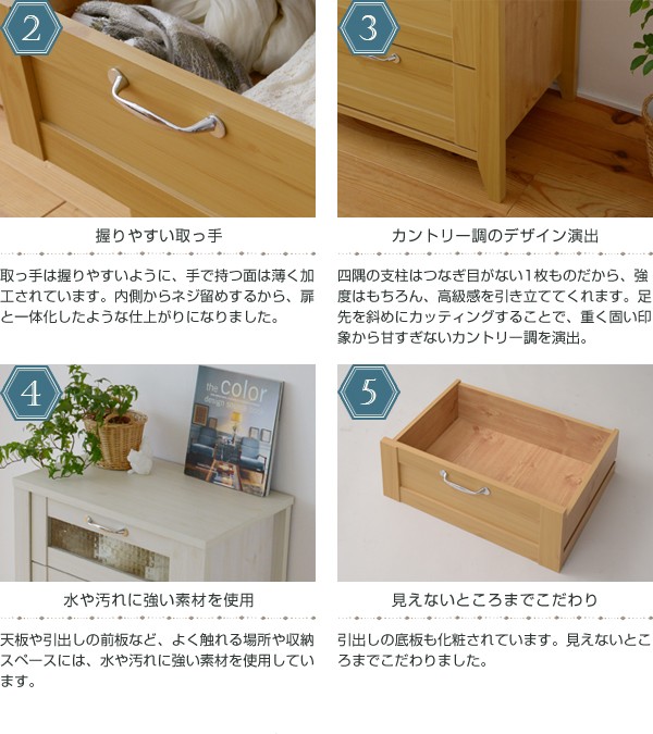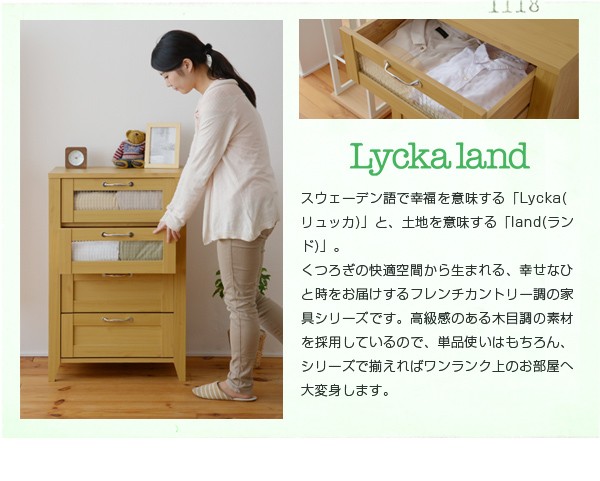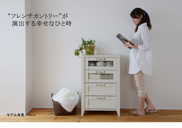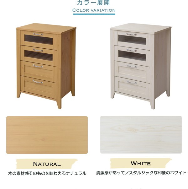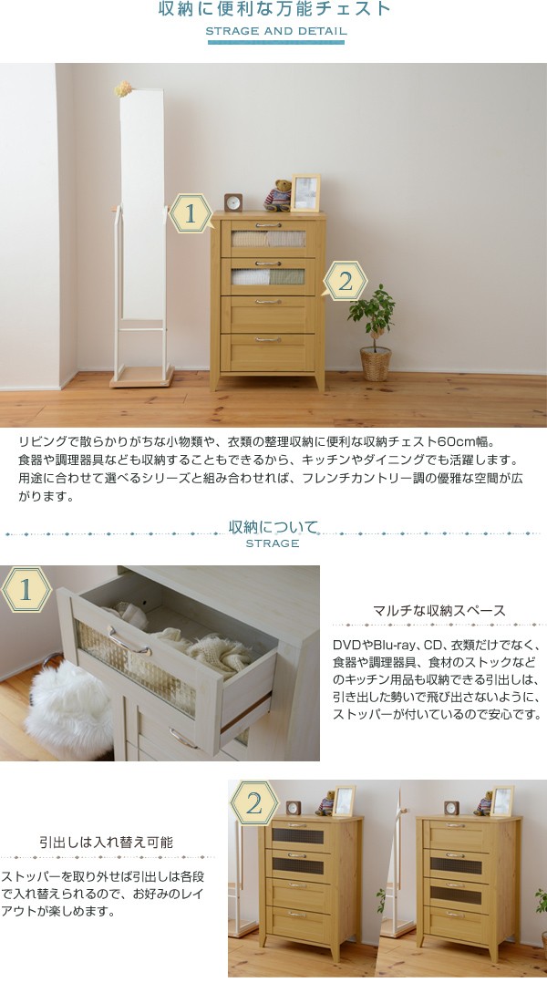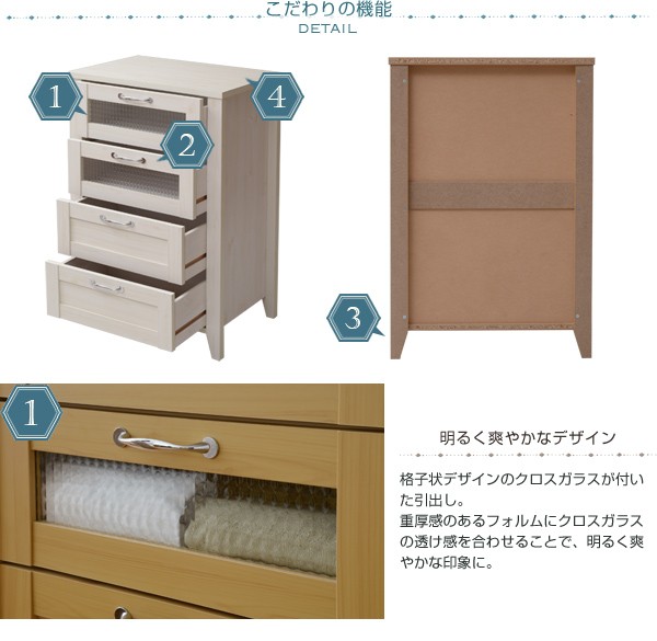 ■商品説明 木目調のシート、型板ガラスがカントリーテイストなリュッカランドシリーズ。リビングラインナップの中の収納チェスト60cm幅。間取りを選ばない適度なサイズ感が普段使いに丁度いい。大きくなくてもしっかり収納できる引出し4杯付なので、衣類から小物までたっぷり収納できます。■本体サイズ [外寸]幅59.5×奥行42.5×高さ90.0cm■組立時間(目安)(大人2人) お客様組立(35分)■キーワード フレンチカントリー 引き出しチェスト 4段 木製 収納 衣類収納 スリムチェスト リビングチェスト おしゃれ スリム ホワイト マルチ収納 収納庫 白 家具 インテリア チェスト 引き出し 収納 棚 リビングキャビネット 収納チェスト ナチュラル