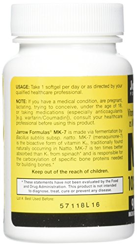 Jarrow FORMULAS MK-7 is an extract from genetically unmodified (non-GMO) soybeans fermented with Bacillus subtilus natto. MK-7 (Menaquinone-7) is an enhanced bioactive form of vitamin K2 from Natto that is ten times better absorbed than K1 from spinach. MK-7 is responsible for the carboxylation of specific bone proteins needed for building bone. Also, MK-7 promotes cardiovascular health by helping to maintain arterial elasticity.