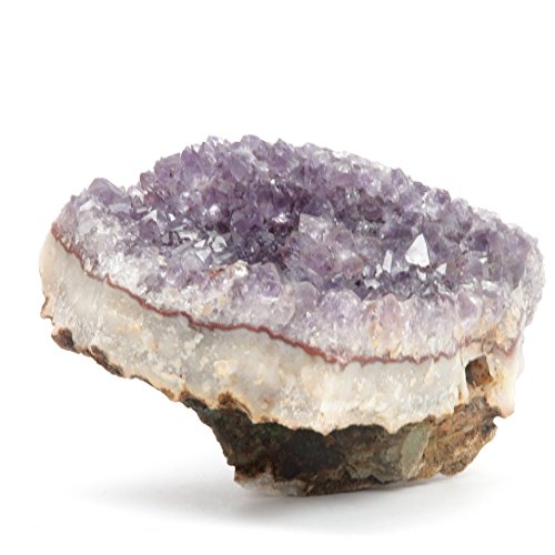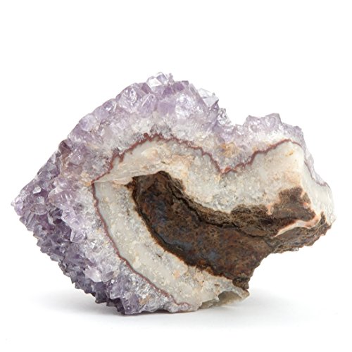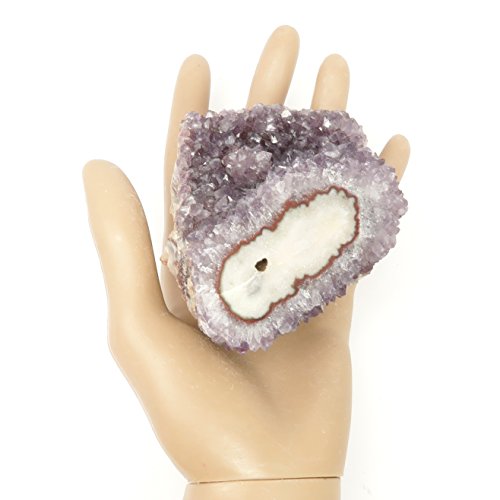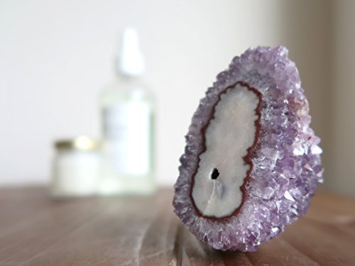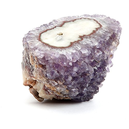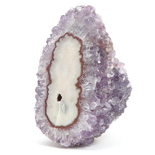 One-of-kind: Your new crystal is an Amethyst Eyes cluster from Artigas, Uruguay. Amethyst is the prized purple form of Quartz, naturally colored by Iron minerals. This is a rocky stone with translucent purple Amethyst crystals and a red-rimmed white Stalactite formation known as the Eye or Flower.