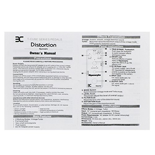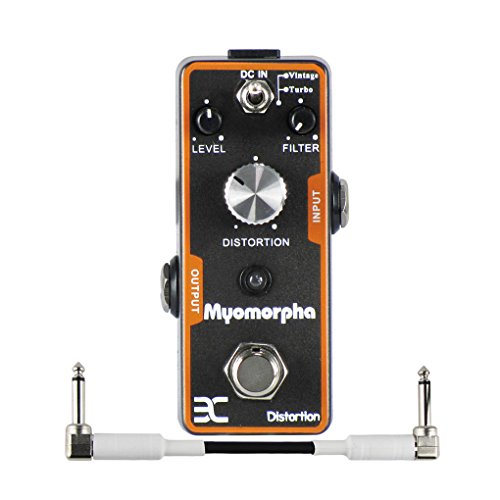 Studio : EX-AMP Publisher : EX-AMP Product Description Feature:* 2 working modes: Vintage / Turbo* With 3 functional knobs: Level knob/ Filter knob/ Distortion knob, to control the performance of the distortion sound.* LED indicator instructs effects or bypass status of Myomorpha effect, when the led is lit up, the effects is on.* Small and exquisite design with full metal shell.* True bypass style, with durable jacks and foot switch.* Can be used Negative DC 9V as Power Supply.Specification:Myomorpha Distortion Effects PedalEffect Modes: Vintage / TurboInput: 1/4" mono jack (impedance: 1M Ohms)Output: 1/4" mono jack (impedance: 1k Ohms)Power Requirements: AC adapter 9V DC (center minus plug)Current Draw: 3 mADimensions: 93.5mm x 42mm x 52mmAccessories: Owner's ManualPlease Read Manual Before Operating.Package Includes:1 x Myomorpha Distortion Effects Pedal1 x Manual1 x Bag1 x Patch Cable 0