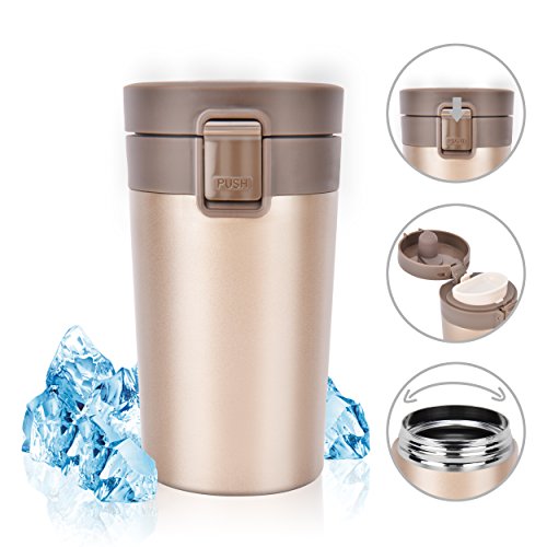 Stainless Steel Insulated Travel Coffee Mug, Rainbrace Double Wall Insulated Coffee Mug Travel Mug Cup Water Bottle Wide Mouth With One Hand Flip Lid 300 ml/10 oz Keep Hot or Cold for Hours(Gold)