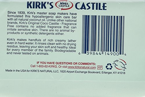 Kirks Natural Fragrance Free Original Coco Castile Bar Soap, 4 Ounce -- 2 per case. Kirks master soap makers have formulated tis hypoallergenic skin care bar with all natural coconut oil. Unlike other national brands, Kirks Original Coco Castile - Fragrance Free, contains no aded fragrance that can irritate sensitive skin. There are no animal by-products or synthetic detergents either. Castile originally referred to the highly-prized vegetable based soap produced in Castile, Spain. For centuries this soap was considered the soap of royalty because of its luxurious lather and gentleness to the skin. Today, Castile refers to any vegetable based soap. Kirks makes handfuls of rich creamy lather even in hard water. It rinses clean with no drying residue, leaving your skin soft and healthy. Ideal for every member of the family. Biodegradable and never tested on animals. Shlef Life: 999 days