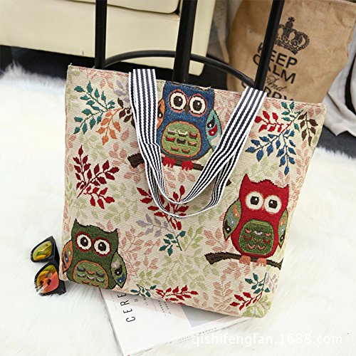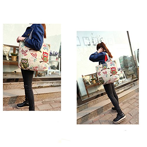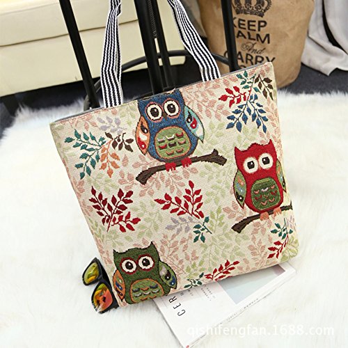 Anlydia Women Canvas Cartoon Owl Printing Shoulder Bag Zipper Tote Bags Satchel Purses