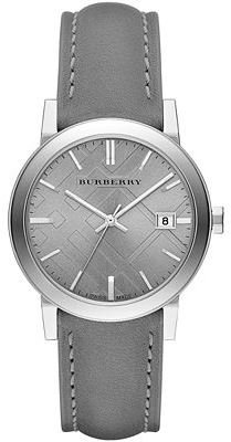 Studio : Burberry Publisher : Burberry Binding : Watch Product Description Stainless steel case with a grey leather strap. Fixed stainless steel bezel. Light grey check stamped dial with silver-tone hands and index hour markers. Minute markers around the outer rim. Dial Type: Analog. Luminescent hands. Date display at the 3 o'clock position. Quartz movement. Scratch resistant sapphire crystal. Pull / push crown. Solid case back. Case diameter: 38 mm. Round case shape. Deployment clasp. Water resistant at 50 meters / 165 feet. Functions: date, hour, minute, second. Casual watch style. Burberry Light Grey Dial Grey Leather Ladies Watch BU9036. 0