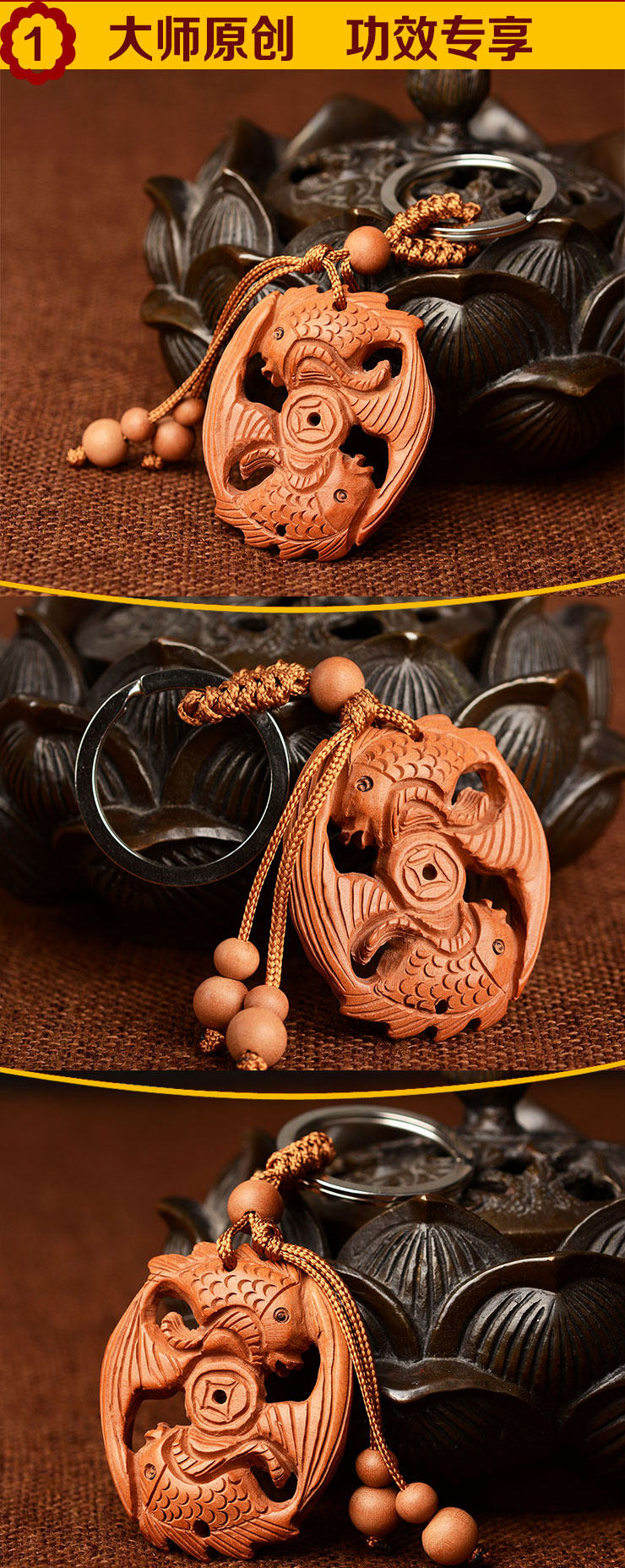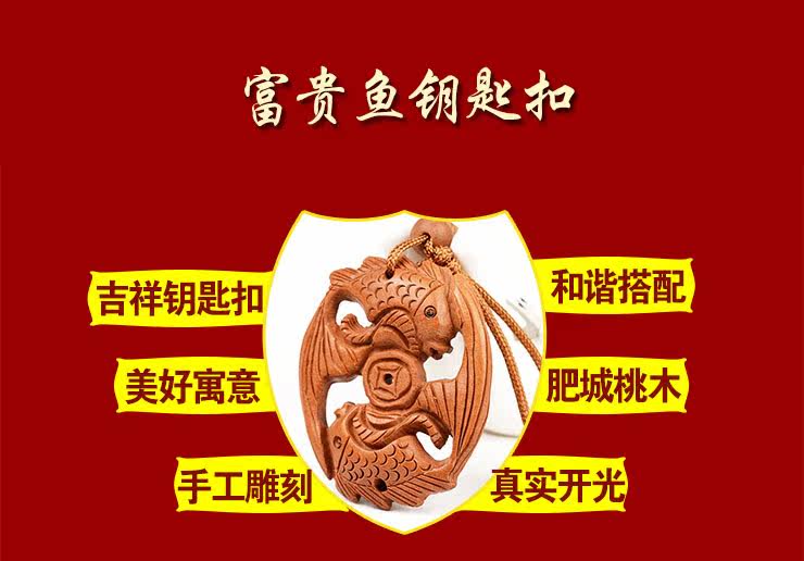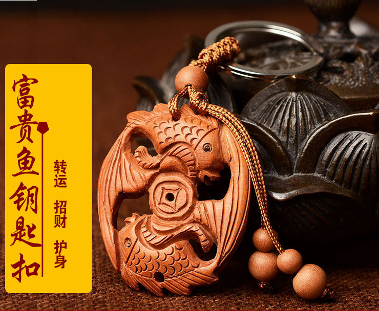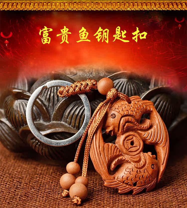 天然桃木富贵鱼招财双鱼钥匙扣挂件情侣男女款创意饰品