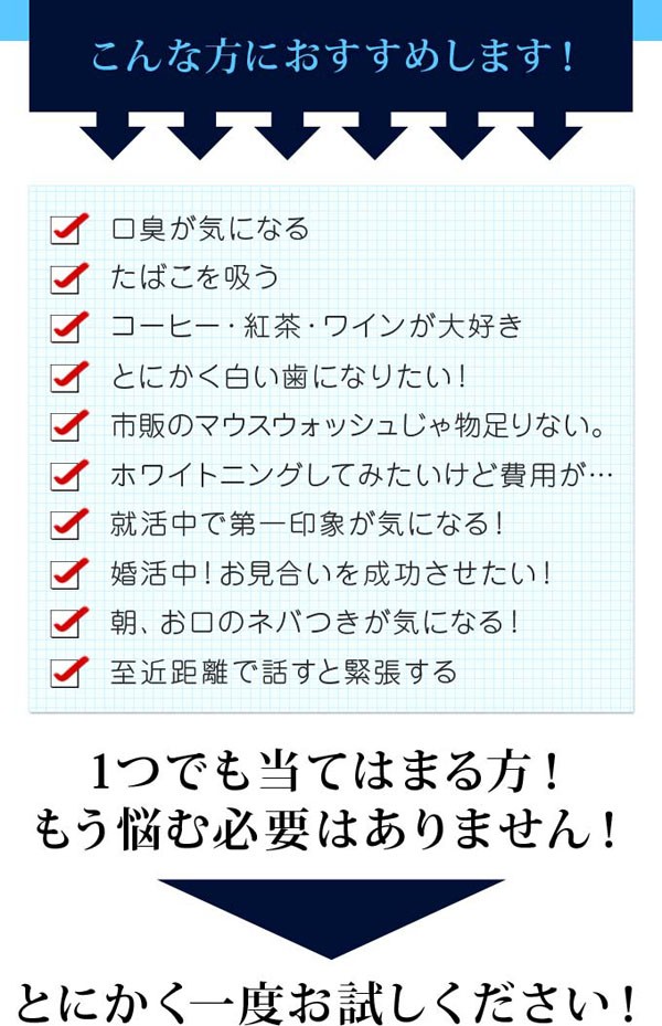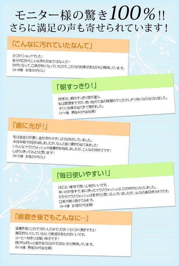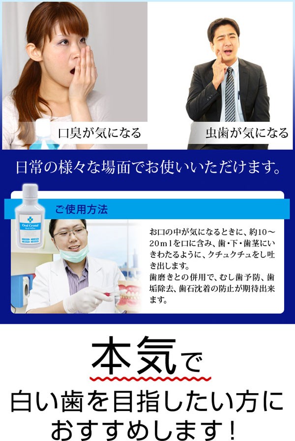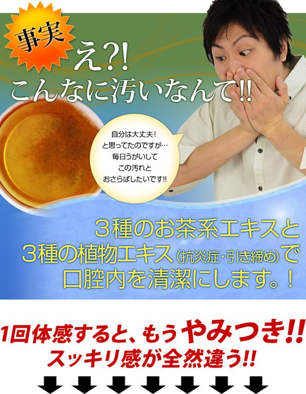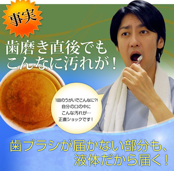口臭が気になるときにお口の中をすっきりさせたい時に、適量を口に含みうがいした後吐き出し、その後ブラッシングをしてください。 |