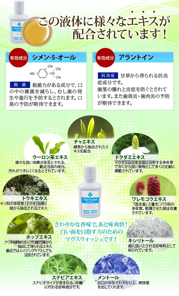 [湿潤剤]ソルビトール液、茶エキス-1、BG、トウキエキス-1、ホップエキス、ワレモコウエキス、ウーロン茶エキス、ドクダミエキス [清涼剤]エタノール、無水エタノール、メントール [矯味剤]キシリトール、ステビアエキス [可溶化剤]POE(60) 水添ヒマシ油 [保存剤]メチルパラベン [pH調整剤]無水クエン酸 [薬用成分]アラントイン、シメン-5- オール カラメル ※アルコール含有 |