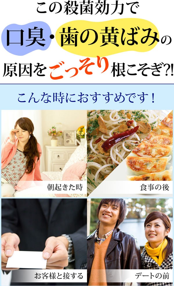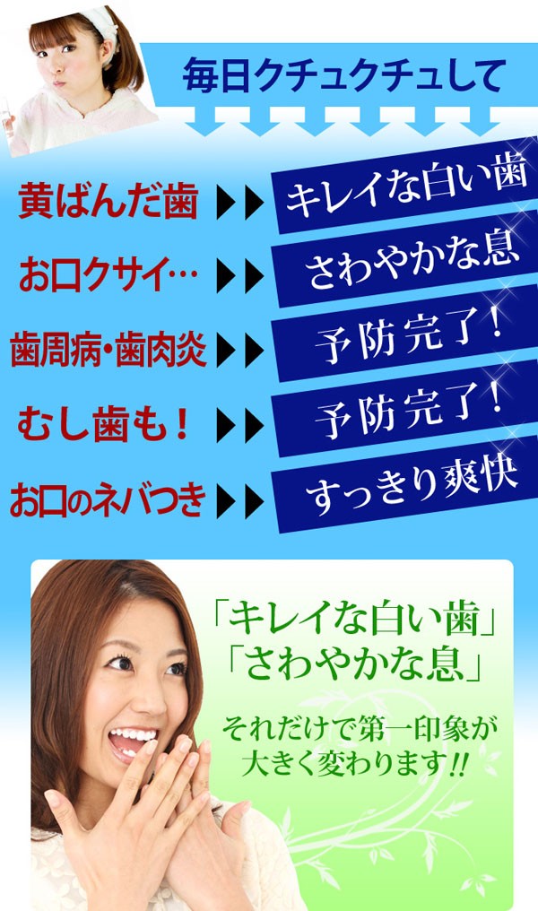 口臭の防止、歯周炎(歯槽膿漏)の予防、歯肉炎の予防、むし歯を防ぐ、歯を白くする、口中を浄化する |