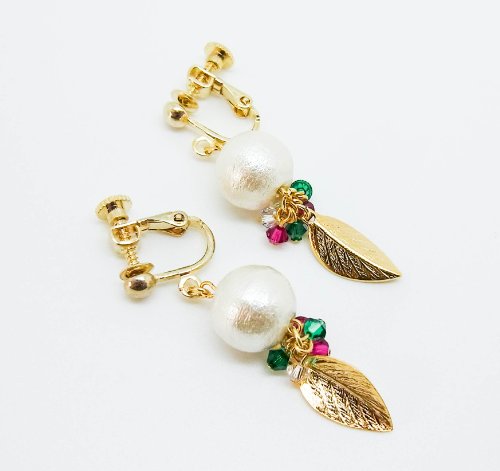 Sheryl & Co. (쉐릴 앤드 칼파):코튼 펄과 스와로브스키,메탈 리프를 편성한 이탈리아 컬러가 밝은 인상의 귀걸이입니다.코튼 펄은 매우 가볍게 골드 리프가 흔들려 반짝반짝 빛납니다.세로 실루엣의 스마트한디자인입니다.