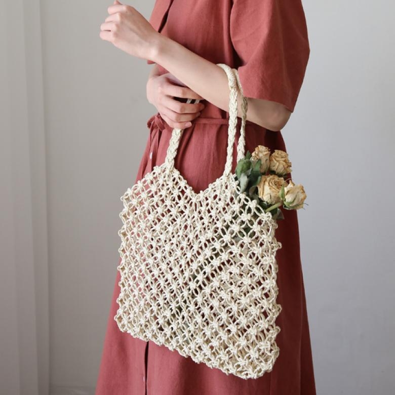 그물망 모양으로 튼튼히 짜여 완성된 독특한 아이템으로 여름에 파우치를 넣어 센슈얼하게 들기 다니기 좋습니다.