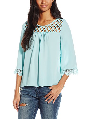 My Michelle Junior's 3/4 Sleeve Top with Lattice Detail at Yoke, Aqua, Medium