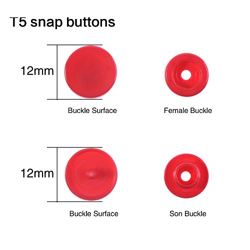 - Snap buttons measurement: each set of snap fasteners is composed of 2 caps, 1 socket and 1 stud, the cap diameter is 12 mm, T5 size, and the buttons are in 10 colors