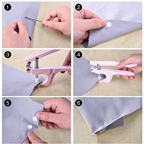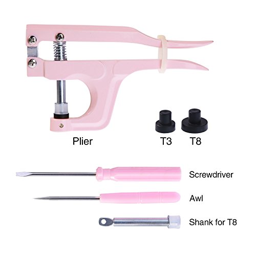 - Quantity: 150 sets of snap buttons in 10 colors, 1 x pink snaps plier, 1 x shank for T8 snap, 1 x pink awl, 1 x pink screwdriver, 2 x black die tray (T3 and T8) and 1 x storage case