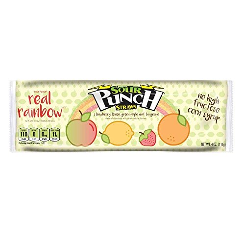 -. Binding : Grocery -. Brand : Sour Punch -. EAN : 0041364056265 -. Feature : Each Unit includes a 12 Pack of 4oz trays perfect for sharing and snacking on the go / TRY OUR NEW NATURALLY FLAVORED and NATURALLY COLORED Real Rainbow Sour Straws. A fruity mix of Strawberry, Lemon, Green Apple and including NEW tangerine / Made with NO High Fructose Corn Syrup but with the same great Sour Punch Taste you love. / You wont feel guilty indulging in this delicious low calorie and always kosher treat! / Proudly made in the USA -. Label : American Licorice-Sour Punch -. Manufacturer : American Licorice-Sour Punch -. NumberOfItems : 1 -. PackageQuantity : 1 -. ProductGroup : Grocery -. ProductTypeName : GROCERY -. Publisher : American Licorice-Sour Punch -. ReleaseDate : 2017-08-01 -. Studio : American Licorice-Sour Punch -. Title : Sour Punch Real Rainbow Chewy Candy Straws 4oz Tray (12 Pack) -. UPC : 041364056265