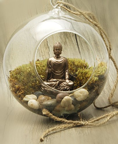 -. Feature : Hanging globe terrarium with moss plant / Comes with pebbles and Buddha statue / Dome is 6 inches wide and 7 inches tall